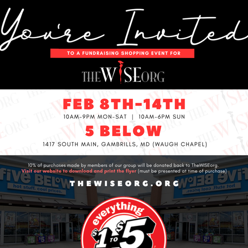 This is a Fundraiser. Present a physical copy of The 5Below/TheWISEorg flyer at check-out Feb 8th through 14th and 10% of your purchase will be donated to TheWISEorg.